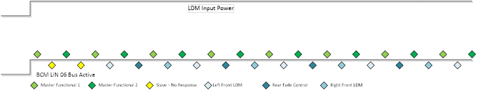 The following diagram illustrates the LIN messaging sequence for the BCM EEL LIN Bus. The BCM will alternate between the two functional command frames. After each command frame, the BCM will process one node frame, cycling thru the LIN nodes. The diagram line shows LIN Bus active from the BCM. Diamonds above the line are BCM Command Frames. Diamonds below the line are Node Status frames. Diamond color illustrates the two BCM messages, three Node responses as well as a couple of No Response cycles while the LIN nodes power up.